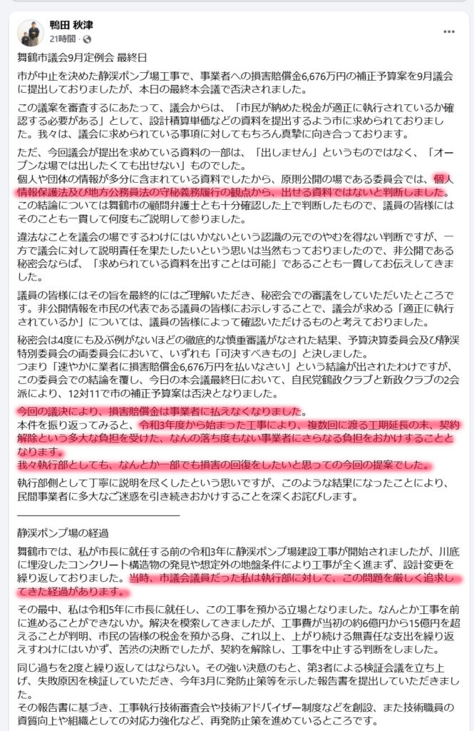 鴨田市長が「全面的に舞鶴市が悪かった」と認めたこと。
