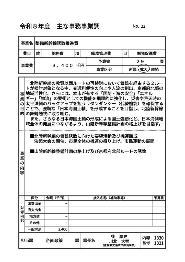 北陸新幹線の舞鶴ルート誘致活動として340万円を計上しました。しかし、北陸新幹線の敦賀以西ルートは